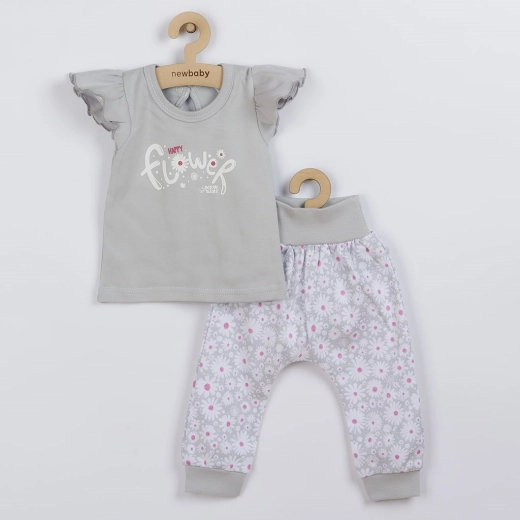 Adorable ensemble deux pièces pour bébé New Baby Happy Flower en gris offrant un confort maximal grâce à un matériau en 100 % coton. Le set comprend un t-shirt à manches volantées et un pantalon de jogging avec large ceinture pour un port agréable. Un excellent choix pour la peau délicate des enfants et pour un usage quotidien.