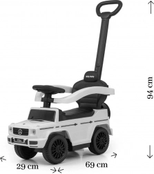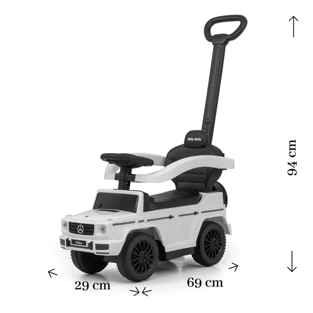 Offrez à votre petit conducteur une expérience authentique de conduite avec le look iconique de la MERCEDES G‑Class. La draisienne est conçue avec le souci du détail et de la qualité : axes de roues métalliques pour une durabilité accrue, assise confortable avec dossier et pratique espace de rangement sous le siège pour les petites affaires. Les roues avant pivotantes et la longue tige de guidage permettent aux parents de manœuvrer facilement, tandis que les éléments de sécurité assurent stabilité et protection anti‑basculement.