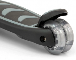 Son grand atout, ce sont les trois roues pour une stabilité maximale – à l’avant, des roues PU lumineuses de 120 mm et, nouveauté, une double roue arrière lumineuse de 80 mm avec frein sur garde-boue. Poignées souples, plateau antidérapant et roulements ABEC-7 assurent une conduite confortable, silencieuse et sûre.