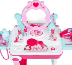 Inclut un sèche-cheveux, un peigne, un collier, des bracelets, des bagues, des “parfums”, des baumes et d’autres accessoires. Le tout en plastique de qualité et sûr pour le jeu des enfants.
