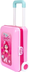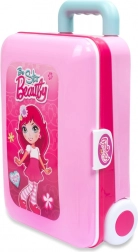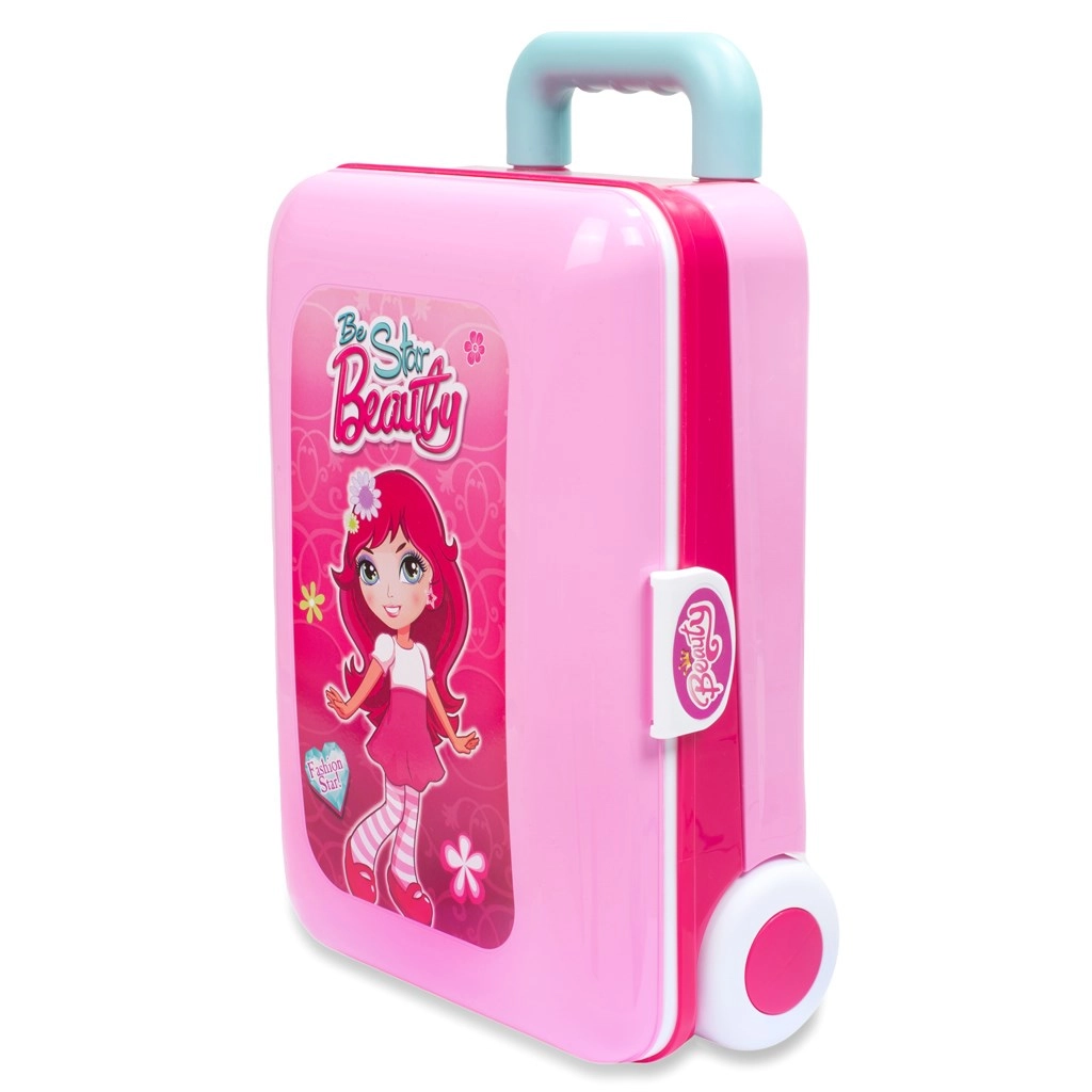 Le riche assortiment comprend un sèche-cheveux, un peigne, un collier, des bracelets, des bagues, un “parfum” et des accessoires de maquillage – tous en plastique non nocif pour la santé et sans véritable cosmétique. Les déplacements sont facilités par les roulettes et la poignée télescopique, afin que la petite maquilleuse emporte son salon partout avec elle.
