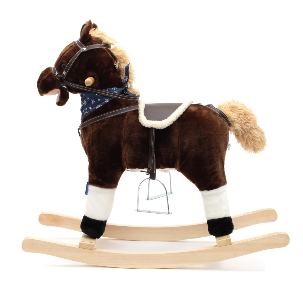 Le cheval à bascule Baby Mix offre aux enfants une expérience de chevauchée authentique. Fabriqué en peluche douce, il possède un foulard stylé et des boutons cachés dans les oreilles qui déclenchent des sons de galop, des hennissements, des mouvements de la queue et de la bouche ainsi qu’une chanson de cow-boy. Les patins de bascule en bois profilés empêchent le basculement, tandis que les étriers métalliques, les poignées et la selle confortable garantissent confort et stabilité pendant la bascule.