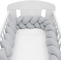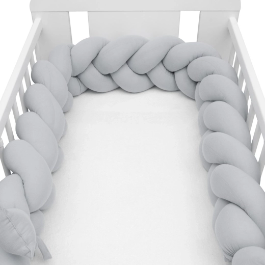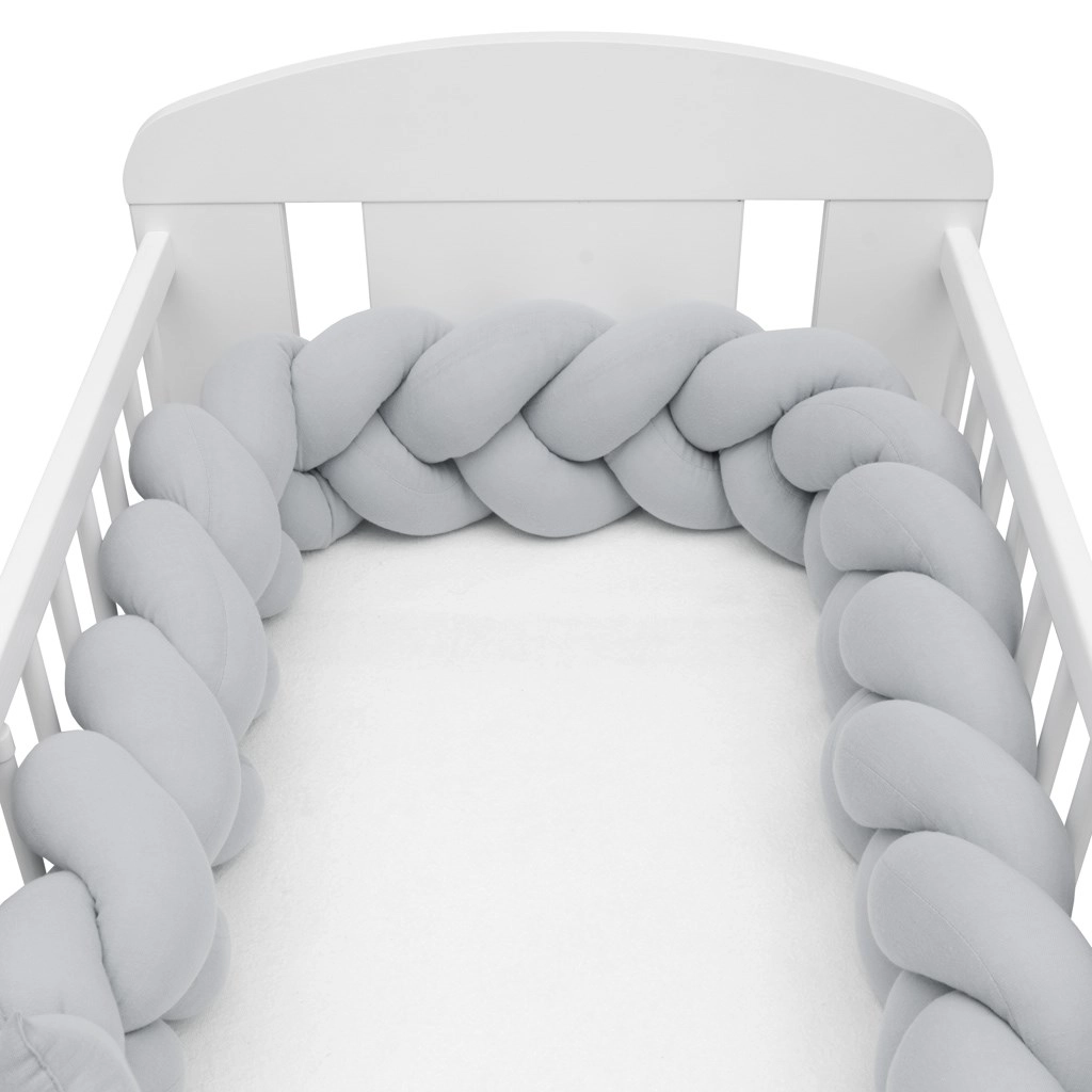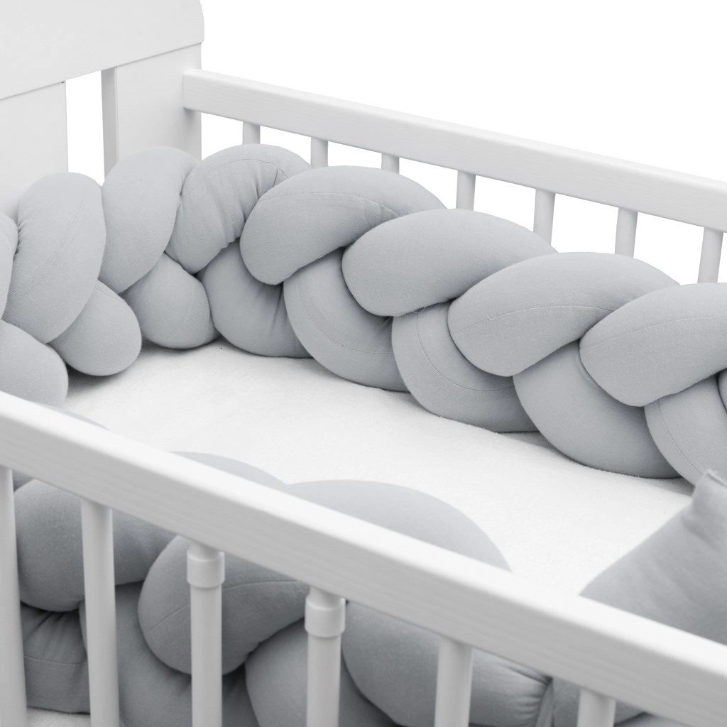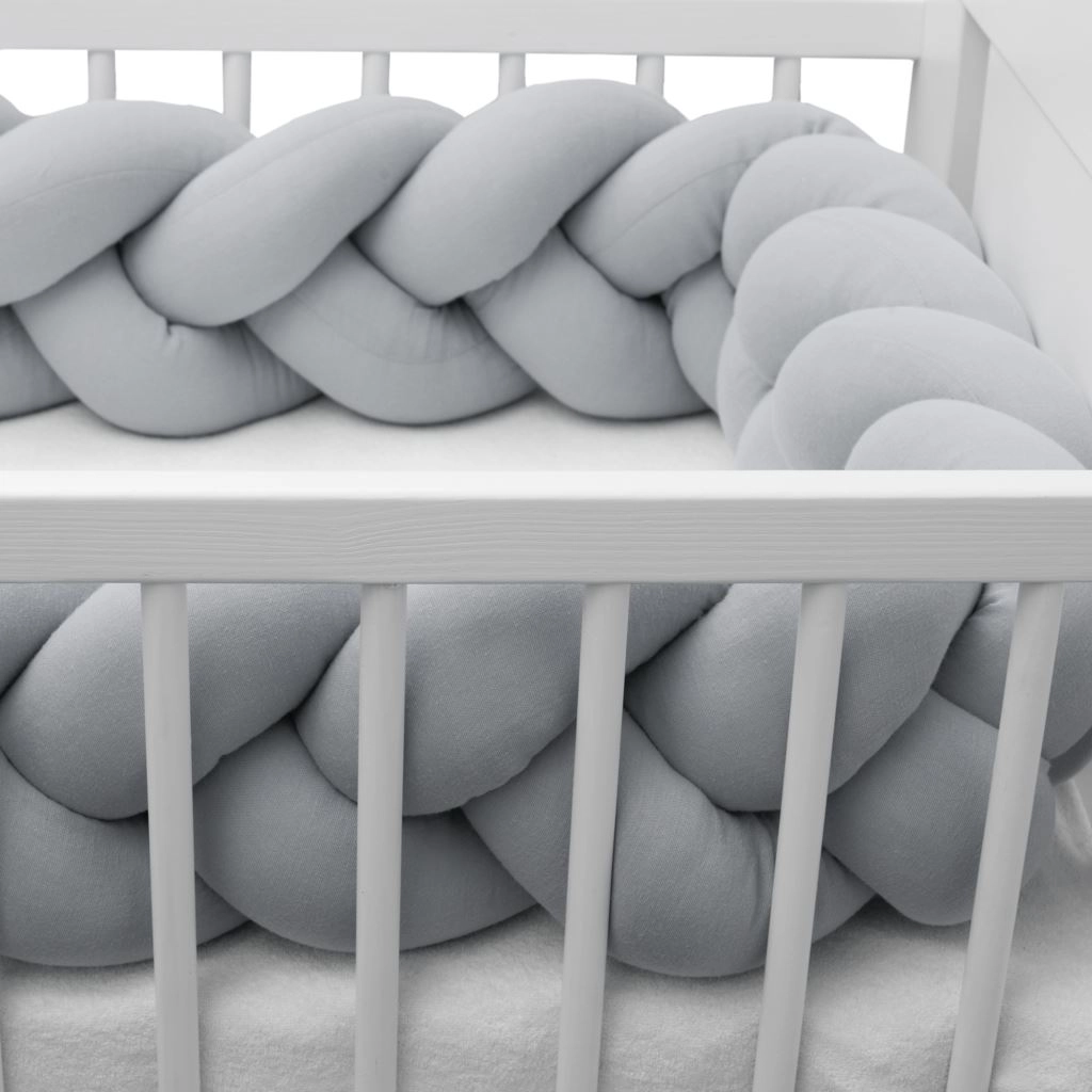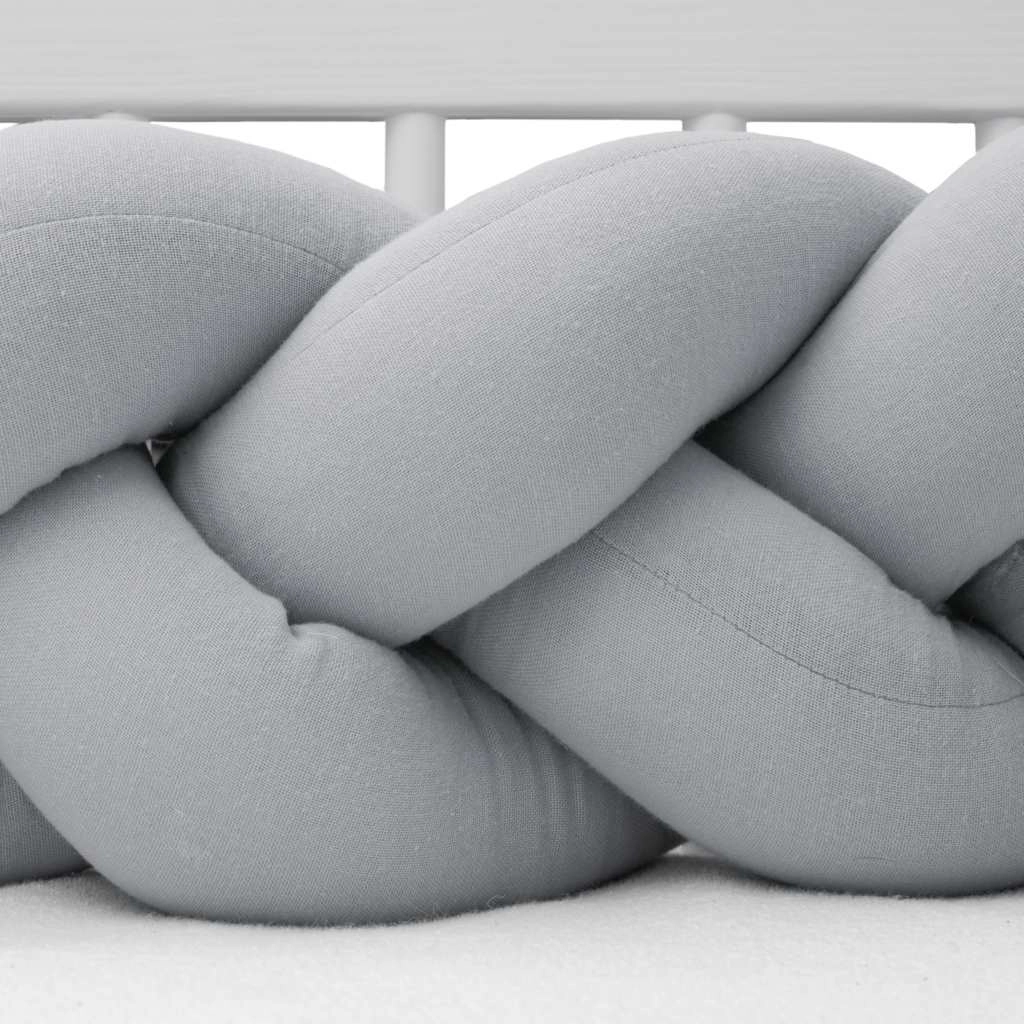 La tresse amortit les chocs contre les barreaux, crée une barrière douillette et s’adapte à différentes formes et tailles de lits.