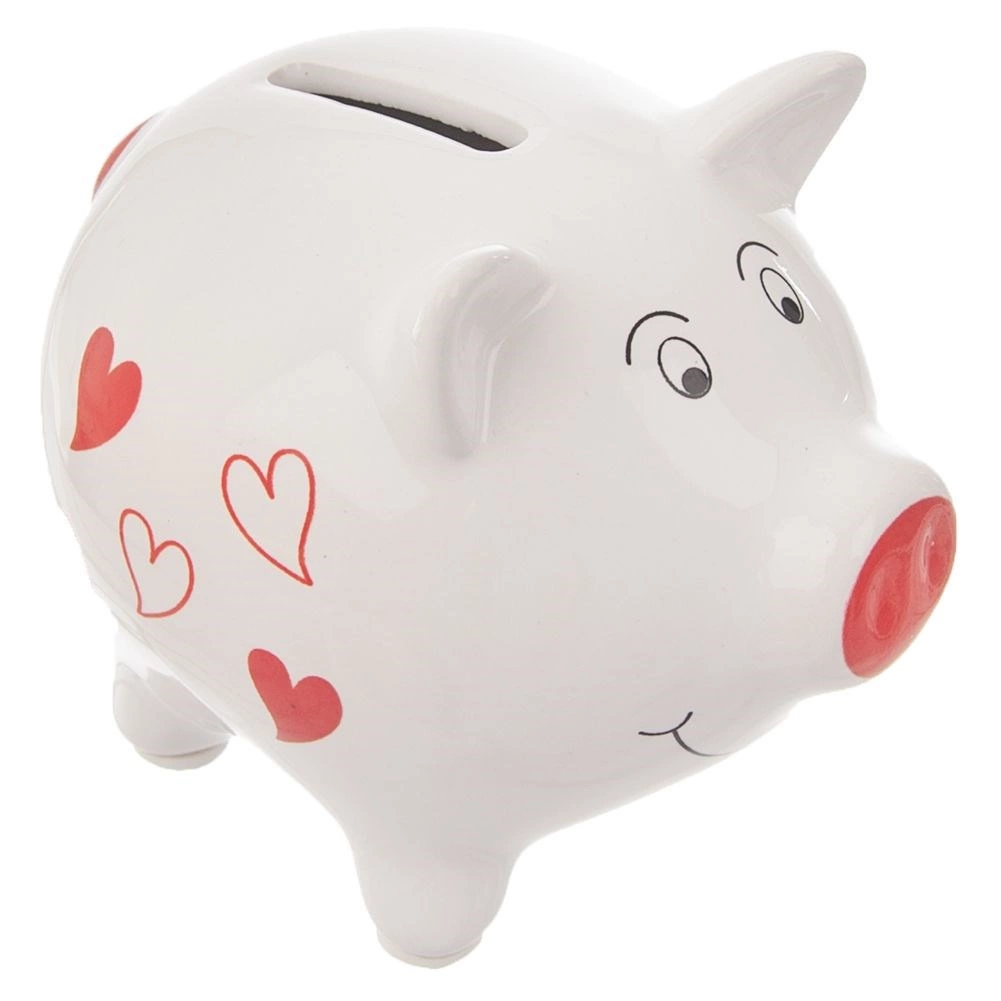Adorable tirelire en céramique en forme de petit cochon avec motif de cœurs, idéale pour les économies du quotidien. Elle a des dimensions compactes et une base stable à quatre pattes, elle tient donc bien sur une étagère comme sur un bureau. Grâce à la céramique blanche de qualité avec des détails rouges, elle est résistante et constitue en même temps un accessoire déco stylé. Une ouverture pratique en dessous permet de retirer les économies sans la casser.