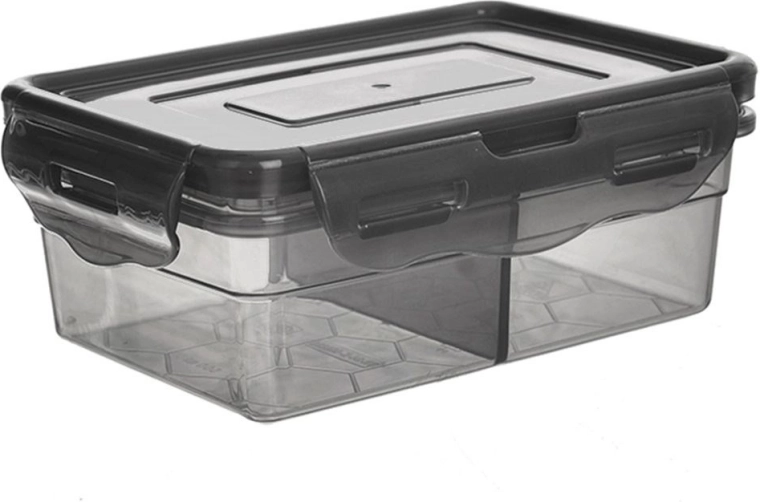 Gardez vos aliments frais et bien organisés grâce à cette boîte compartimentée avec couvercle hermétique. Le matériau transparent gris foncé permet de vérifier le contenu sans ouverture, tandis que l’insert d’étanchéité en silicone et les 4 clips robustes assurent une fermeture fiable et réduisent au minimum le risque de fuites.