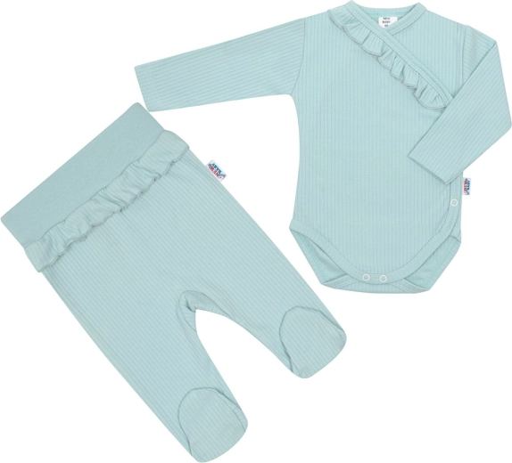 Adorable ensemble bébé 2 pièces en coton NEW BABY Stripes de couleur bleu glacé comprenant un body et un pantalon à pieds. Il est fabriqué en 100 % coton doux, moelleux et délicat pour la peau sensible. Fermeture pratique par pressions pour faciliter l’habillage et le change, et taille élastique du pantalon à pieds qui ne comprime pas le ventre. Le motif rayé moderne apporte du style au quotidien.