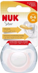 Sucette en latex NUK Star, douce et ergonomique, pour bébés de 0–6 mois, avec anneau pratique pour une prise en main facile. Offre une zone extra souple pour une adhérence confortable au palais, favorise le bon développement de la mâchoire et, grâce au système d’air NUK, laisse la peau respirer. Sans BPA, résistante à l’ébullition et facile à nettoyer.