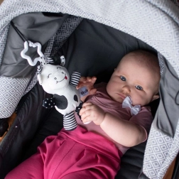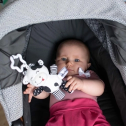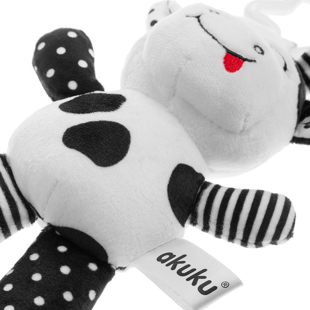 Cette vache en peluche noir et blanc AKUKU est une excellente compagne pour les premiers mois de vie. Grâce à ses couleurs contrastées, elle attire l’attention des nouveau-nés et soutient la perception visuelle. Le hochet intégré émet un son agréable qui stimule l’ouïe et motive les enfants à saisir et à explorer.
