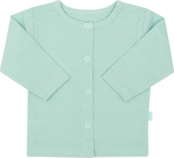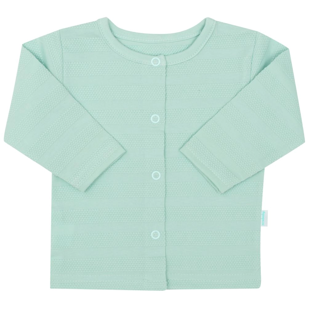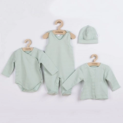 Ensemble nouveau-né pour la maternité New Baby I AM de couleur menthe, composé de 4 pièces pratiques : body portefeuille, grenouillère, gilet et bonnet. Confectionné en 100 % coton, doux, respirant et délicat pour la peau sensible des nouveau-nés. Manipulation facile grâce aux pressions sur toute la longueur pour simplifier l’habillage et le change.