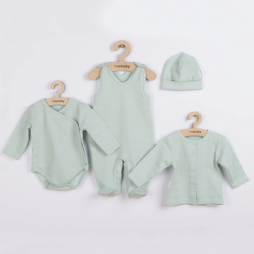 Coffret 4 pièces comprenant body, grenouillère, gilet et bonnet dans un design menthe coordonné – présenté dans une boîte cadeau éco.