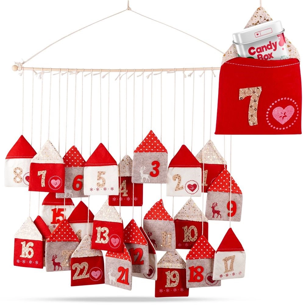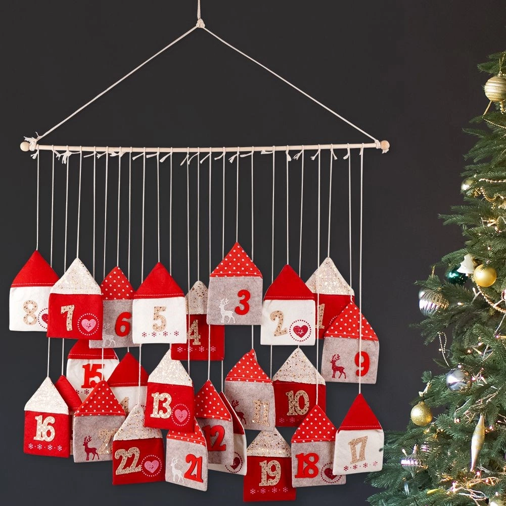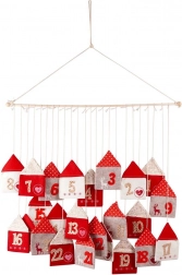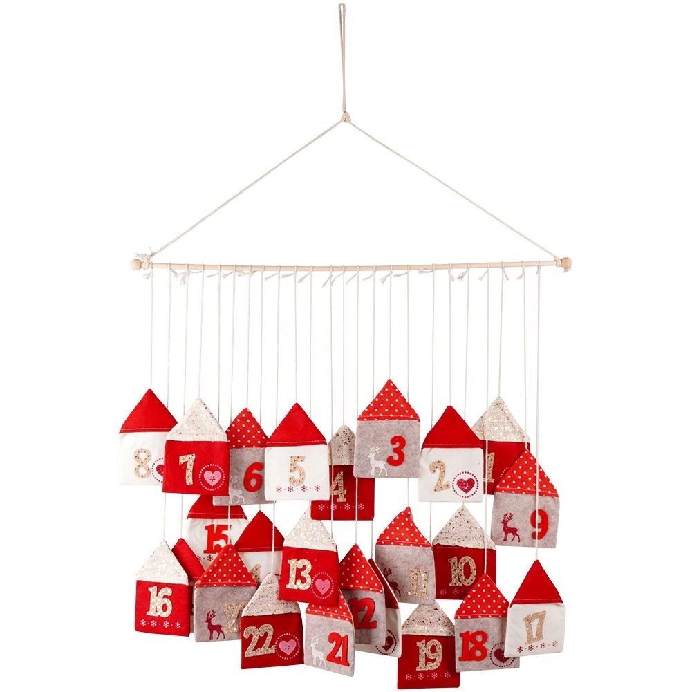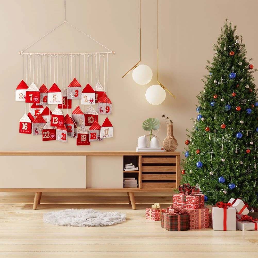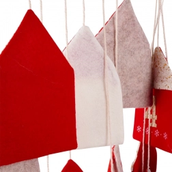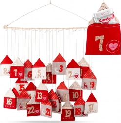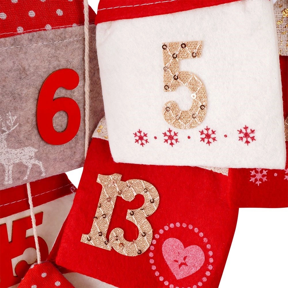 Tissu agréable, numéros 1–24 et motifs festifs en rouge, blanc et beige pour une ambiance intérieure chaleureuse.
