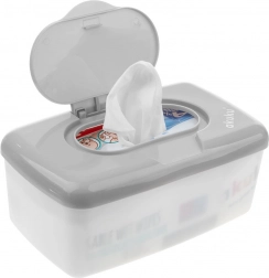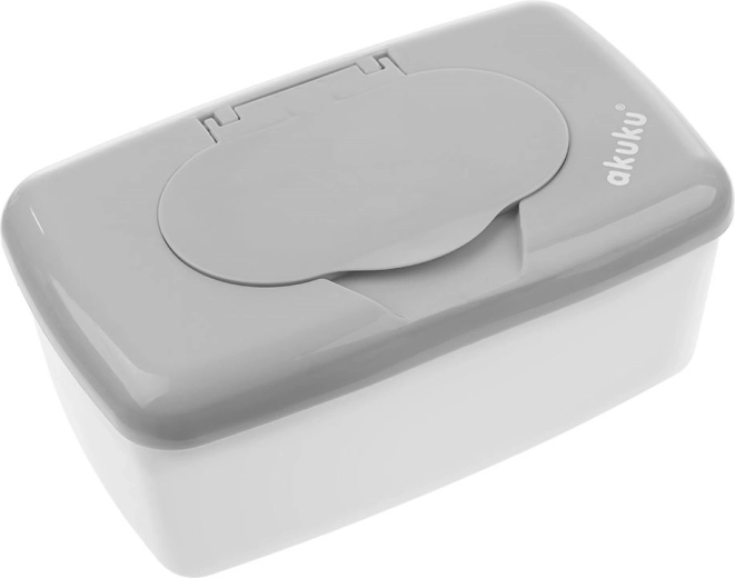 Boîte pratique pour lingettes humides AKUKU en coloris gris qui garde les lingettes fraîches et non desséchées à la maison comme en déplacement. Grâce à ses dimensions compactes, elle se glisse facilement dans un sac, est légère et son couvercle avec un grand bouton permet une ouverture à une seule main.