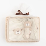 L’ensemble est soigneusement emballé dans un panier en osier avec tulle et ruban, prêt à offrir. Le coton bio provient de cultures sans pesticides ni produits chimiques, ce qui rend la matière naturellement douce, souple et durable.