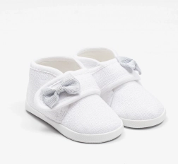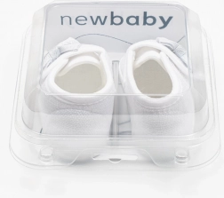 Des chaussons pour bébé New Baby stylés pour filles et garçons, ornés d’un délicat nœud et dotés d’une coupe confortable. La fermeture à scratch facilite l’enfilage, tandis que le large espace intérieur permet une liberté de mouvement des orteils et un développement naturel des muscles. Les chaussons sont ultra légers et possèdent une fine semelle synthétique, non conçue pour la marche – idéals à la maison, pour la poussette ou les séances photo.