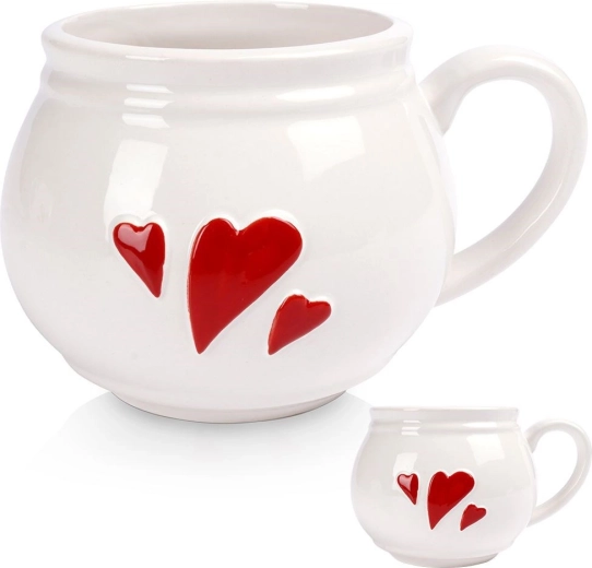 Élégant mug blanc en céramique avec petits cœurs rouges en relief et anse ergonomique, idéal pour boire du café, du thé ou du cacao au quotidien. Il offre une capacité de 430 ml, une conception robuste, passe au lave-vaisselle et au micro-ondes. Parfait aussi pour le vin chaud et, grâce à son design romantique, c’est un excellent cadeau.
