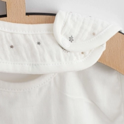Bavoir en mousseline pratique et doux pour bébé de la marque tchèque New Baby Arthur. Grâce aux boutons-pression à deux tailles, il s’ajuste parfaitement, est respirant, léger et exceptionnellement doux pour la peau délicate des enfants. Le tissu en mousseline évite la surchauffe, assure une bonne aération et devient plus souple à chaque lavage. Certification OEKO-TEX STANDARD 100 pour la sécurité des enfants.