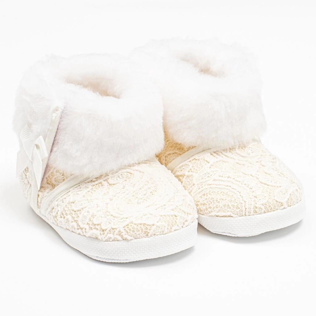 Adorables chaussons pour bébé New Baby au look dentelle avec une douce fourrure synthétique, gardant les petits pieds bien au chaud et confortables. Grâce à leur conception légère, à un intérieur spacieux pour la libre mobilité des orteils et à une semelle fine et flexible, ils sont idéaux pour un usage quotidien dans la poussette. La fermeture pratique par velcro facilite l’enfilage.