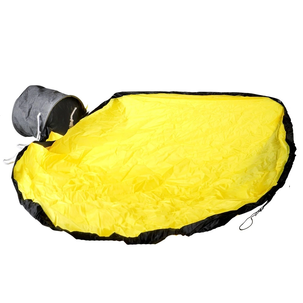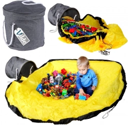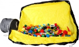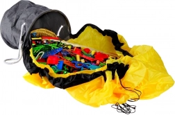 Le grand tapis jaune à bordure noire se resserre après le jeu grâce au cordon et se transforme en sac – les jouets ne se cachent pas sous les meubles et le rangement est terminé en une minute.