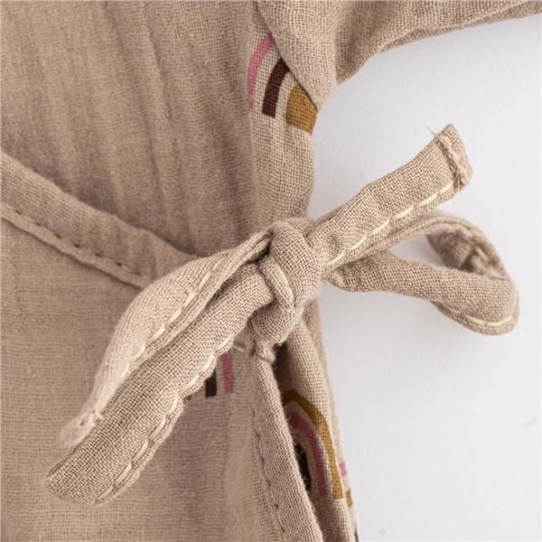 Sa conception pratique avec fermeture latérale par liens permet un habillage facile sans passer par la tête, tandis que les pressions à l’entrejambe accélèrent le change. La mousseline se distingue par sa résistance – elle supporte les lavages fréquents et devient encore plus douce et souple avec le temps. L’imprimé intégral aux motifs arc-en-ciel apporte une touche ludique.