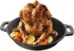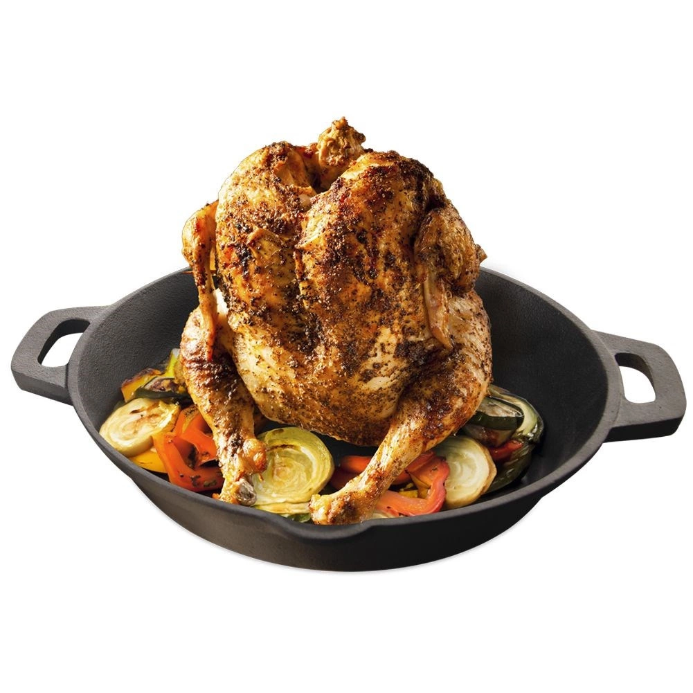 Cette poêle en fonte massive avec support intégré est faite pour un poulet rôti parfait – y compris le style « bière sous le poulet ». Le pic central peut être rempli de bière ou de vin pour une jutosité et un arôme supplémentaires, tandis que les pommes de terre ou les légumes trouvent aisément leur place autour. La fonte assure une distribution uniforme de la chaleur et la conserve longtemps, pour que les plats restent chauds plus longtemps.