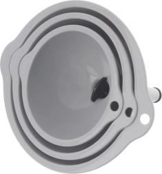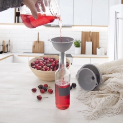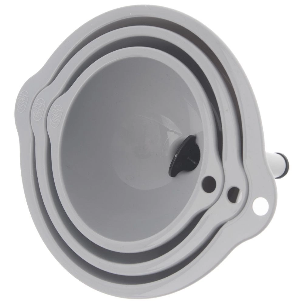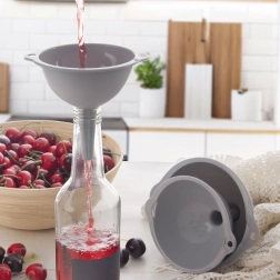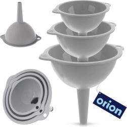 Le set de trois entonnoirs aux tailles universelles facilite le travail quotidien en cuisine. Les différents diamètres permettent un remplissage précis des bouteilles, bocaux et boîtes sans renverser. La conception durable en plastique de qualité, de couleur grise, est à la fois légère et robuste, assurant une utilisation longue durée.