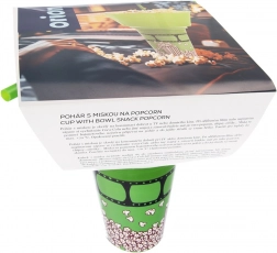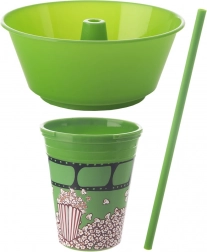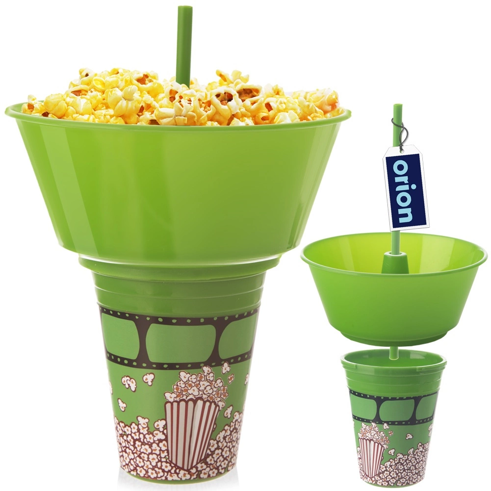 La solution 2-en-1 pratique combine un gobelet inférieur pour la boisson et un bol supérieur amovible pour le popcorn ou d’autres snacks. La paille intégrée au centre permet de boire sans interrompre le divertissement, tandis que le bol accueille suffisamment de gourmandises pour un grignotage confortable. La finition verte avec motif popcorn est parfaite à la maison comme en sortie cinéma.