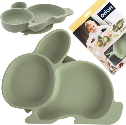 Assiette pour enfant pratique avec trois compartiments en forme de lapin pour servir facilement repas et collations. Grâce à une forte ventouse, elle adhère fermement à la table, résiste aux températures de -20 °C à +120 °C et convient au lave-vaisselle, au micro-ondes et au congélateur. Fabriquée en silicone de qualité de couleur verte.