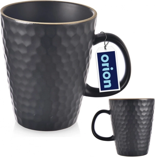 Mug noir élégant en grès de haute qualité d’une capacité de 420 ml, avec un relief rappelant un rayon de miel. Il offre une anse confortable, un aspect moderne mat et convient au lave-vaisselle et au micro-ondes – idéal pour le café, le thé ou le cacao au quotidien.