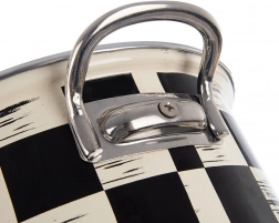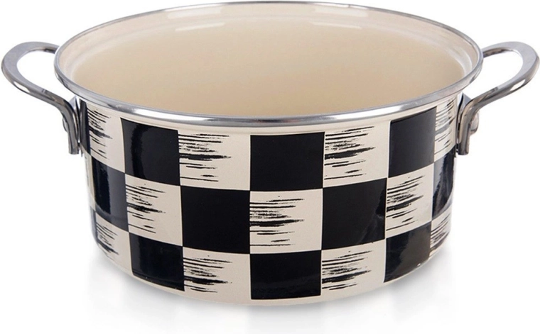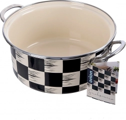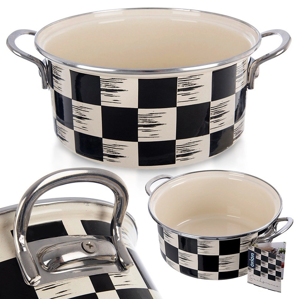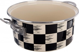Casserole émaillée de 3 l d’un diamètre de 22 cm et d’une hauteur de 10 cm, idéale pour cuire et mijoter soupes, sauces et plats individuels. Elle associe un design rétro au motif d’échiquier noir‑beige à une acier émaillé robuste, avec rebord en inox et poignées métalliques solides. Compatible avec tous les types de feux, y compris induction, utilisable au four et au lave‑vaisselle. L’émail est sans danger pour la santé et convient aux personnes allergiques.