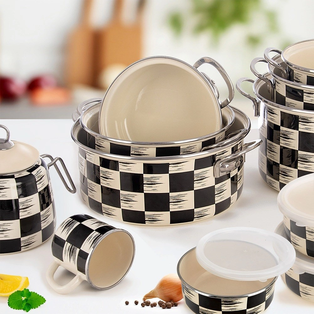Cette casserole pratique en acier émaillé se distingue par son usage polyvalent et son look intemporel. Le décor en échiquier noir‑beige s’intègre parfaitement aux cuisines modernes comme rustiques. L’intérieur en émail beige est lisse, facile à nettoyer et respectueux des aliments.
