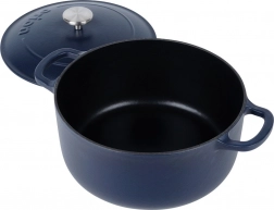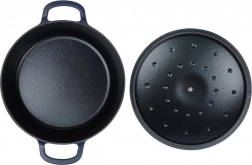 Cocotte universelle en fonte avec couvercle, capacité 5,2 l, pour la cuisine quotidienne: cuisson, mijotage et rôtissage. Grâce à la répartition homogène de la chaleur, à la longue accumulation de chaleur et à la résistance jusqu’à 250 °C, elle réussit soupes, goulaschs et rôtis sur la cuisinière, au four et au grill. La surface intérieure émaillée facilite la cuisson et le nettoyage aisé; la poignée en acier inoxydable du couvercle et les larges poignées latérales assurent une manipulation sûre.