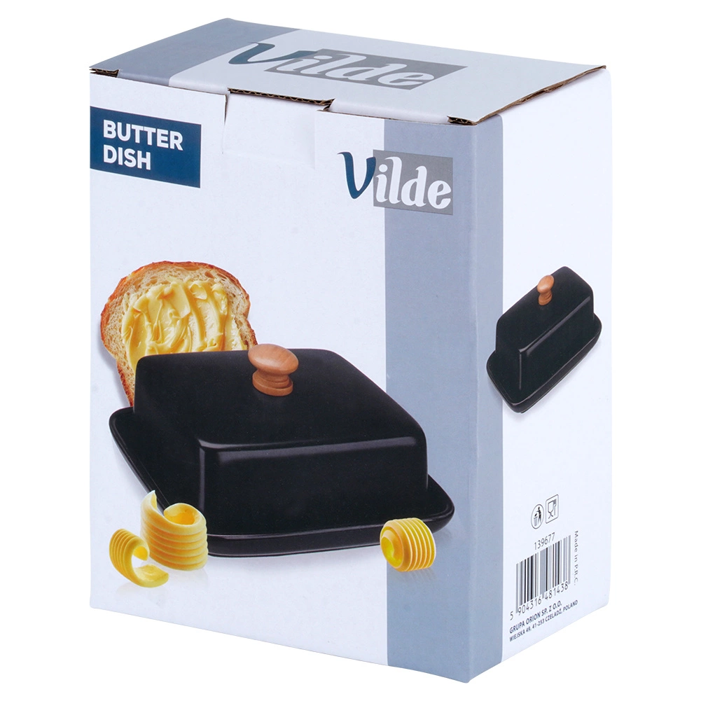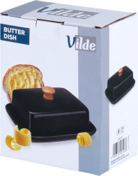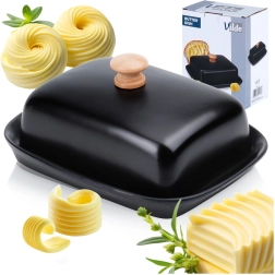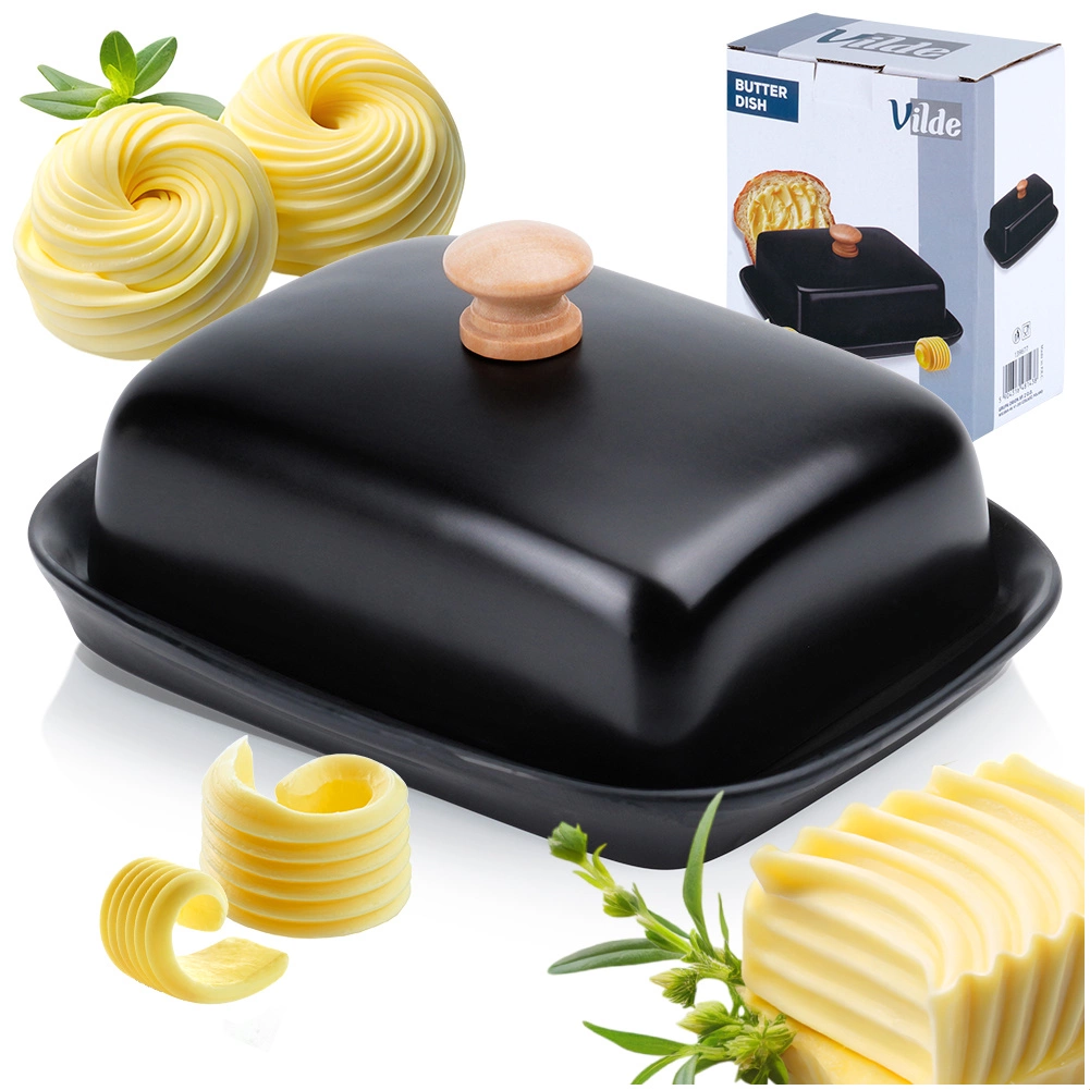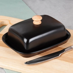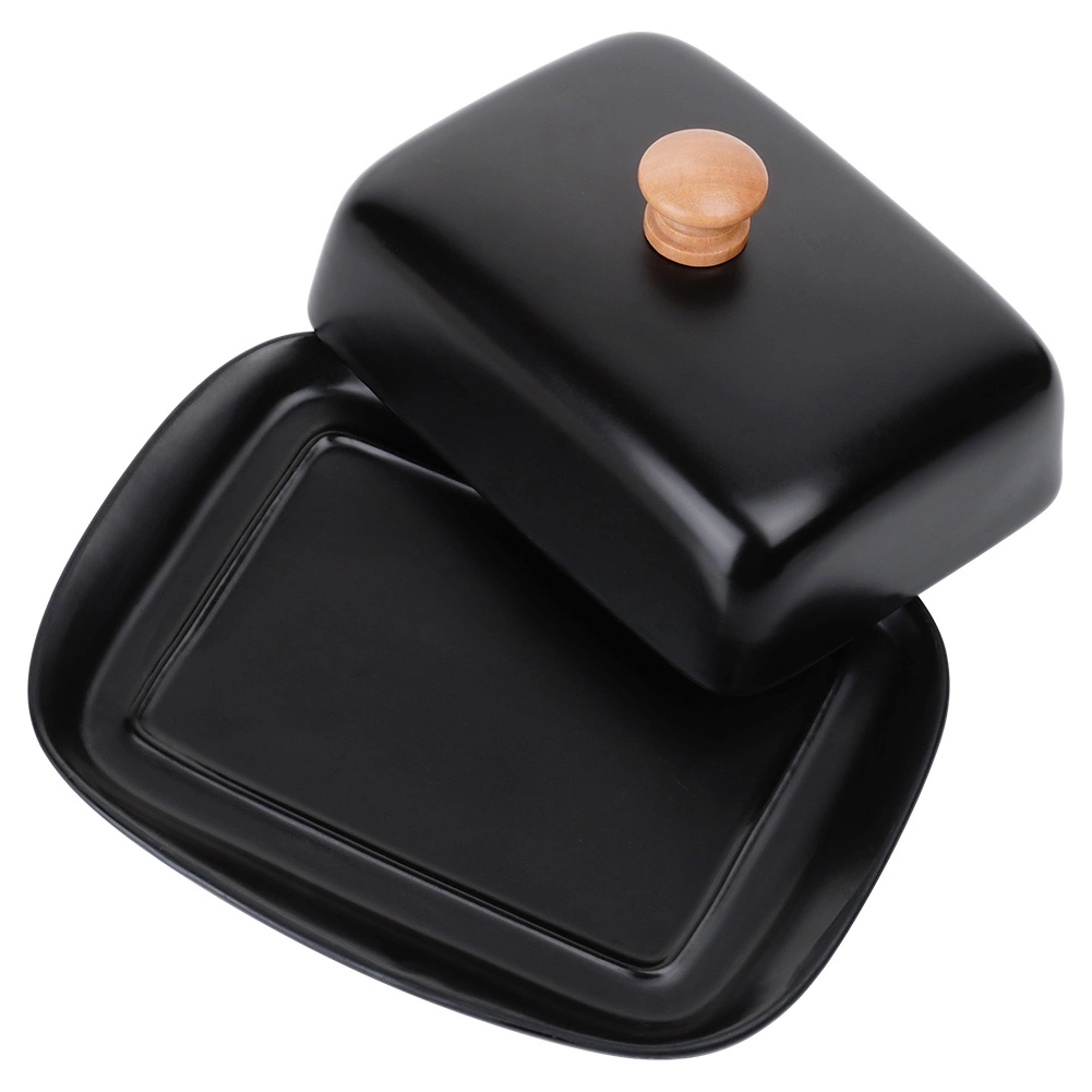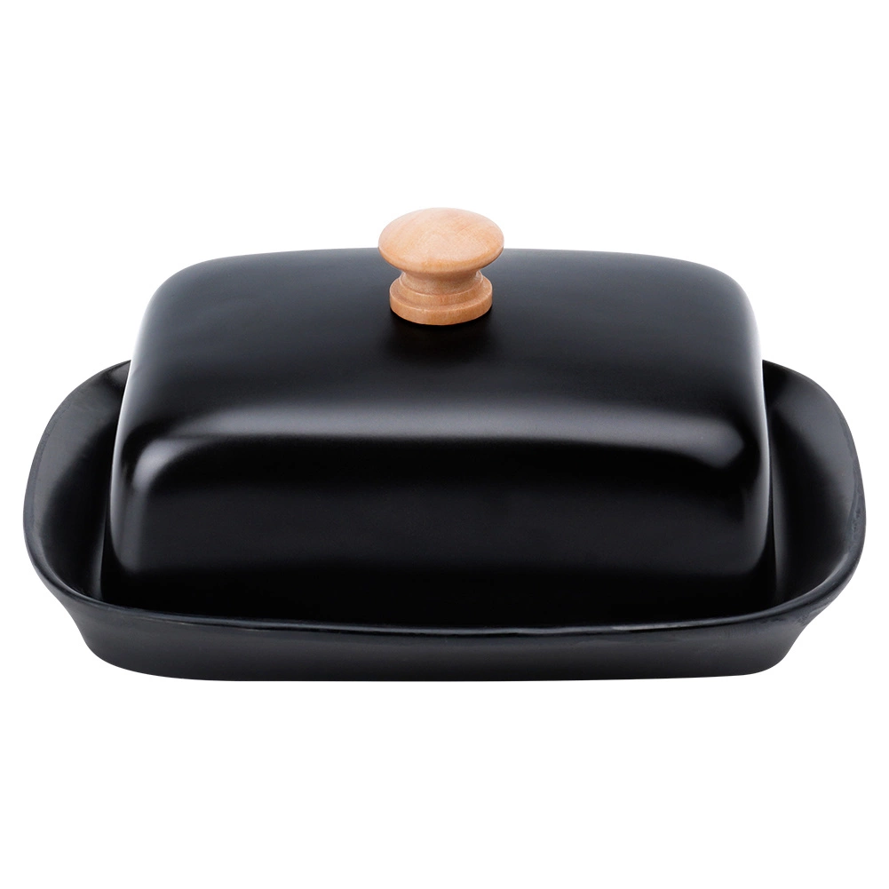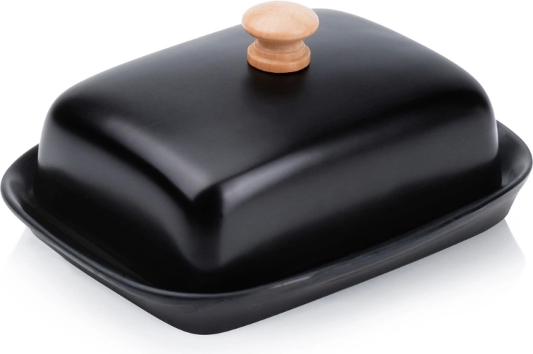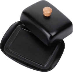 Ce beurrier stylé en céramique de qualité, en finition noire, est idéal pour un usage quotidien à la maison comme pour le service à table. La poignée en bois du couvercle permet une prise en main confortable, tandis que le couvercle ajusté protège le beurre du dessèchement et des odeurs étrangères.