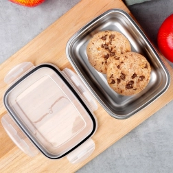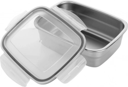 Le couvercle transparent avec joint en caoutchouc et 4 clips robustes assure une fermeture fiable sans fuite. Le bol en inox maintient mieux la température souhaitée des plats – chauds ou froids – et résiste aux odeurs et aux taches. La boîte passe au lave-vaisselle.