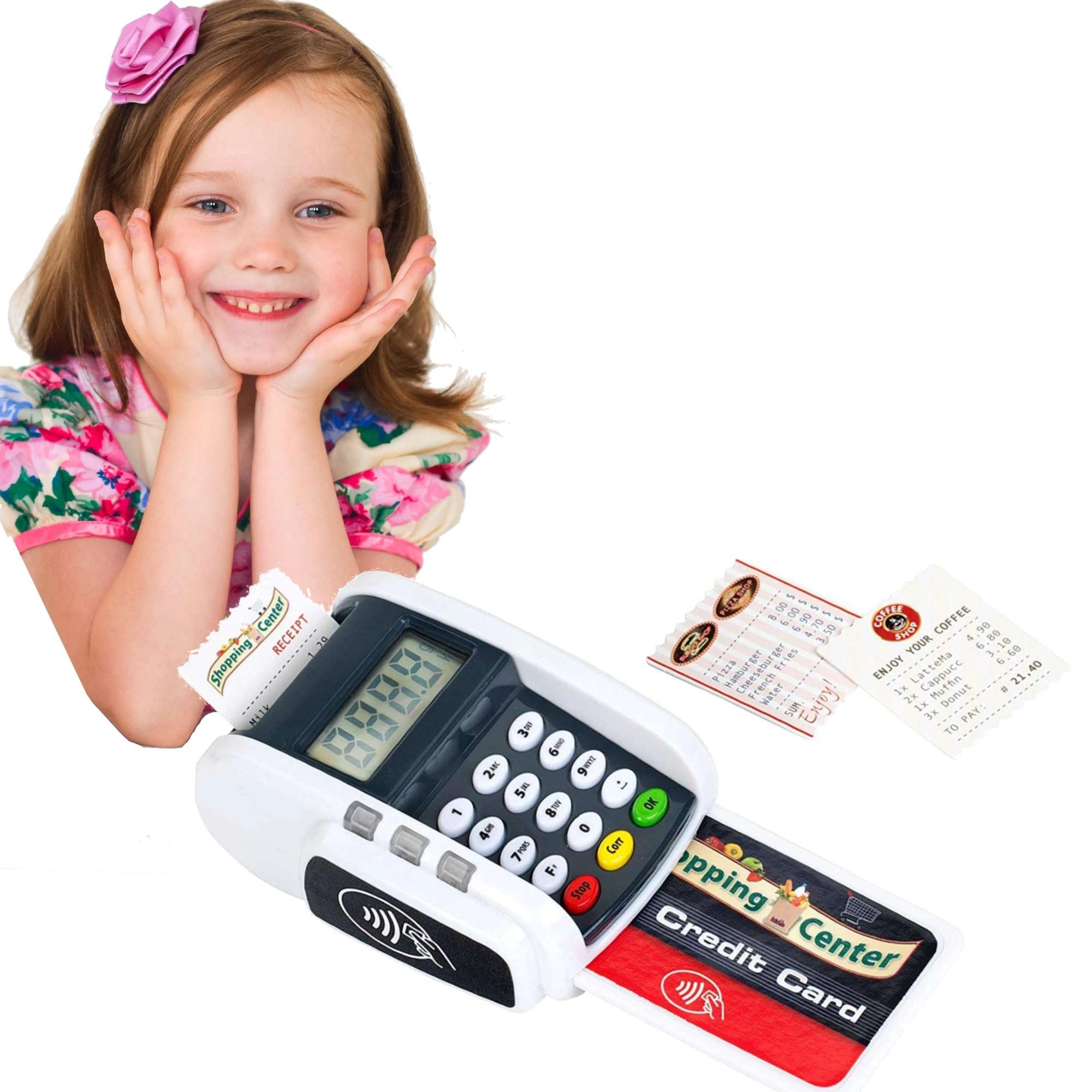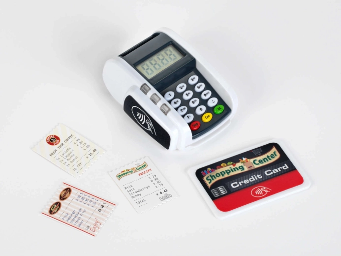 Ce terminal compact imite fidèlement un véritable appareil : les enfants peuvent appuyer sur le clavier numérique, présenter une carte de paiement et imprimer des « reçus » pour un jeu de caisse réaliste. Les effets lumineux et sonores donnent à chaque transaction une touche de réalité et favorisent le développement des compétences sociales.