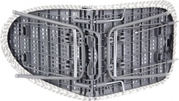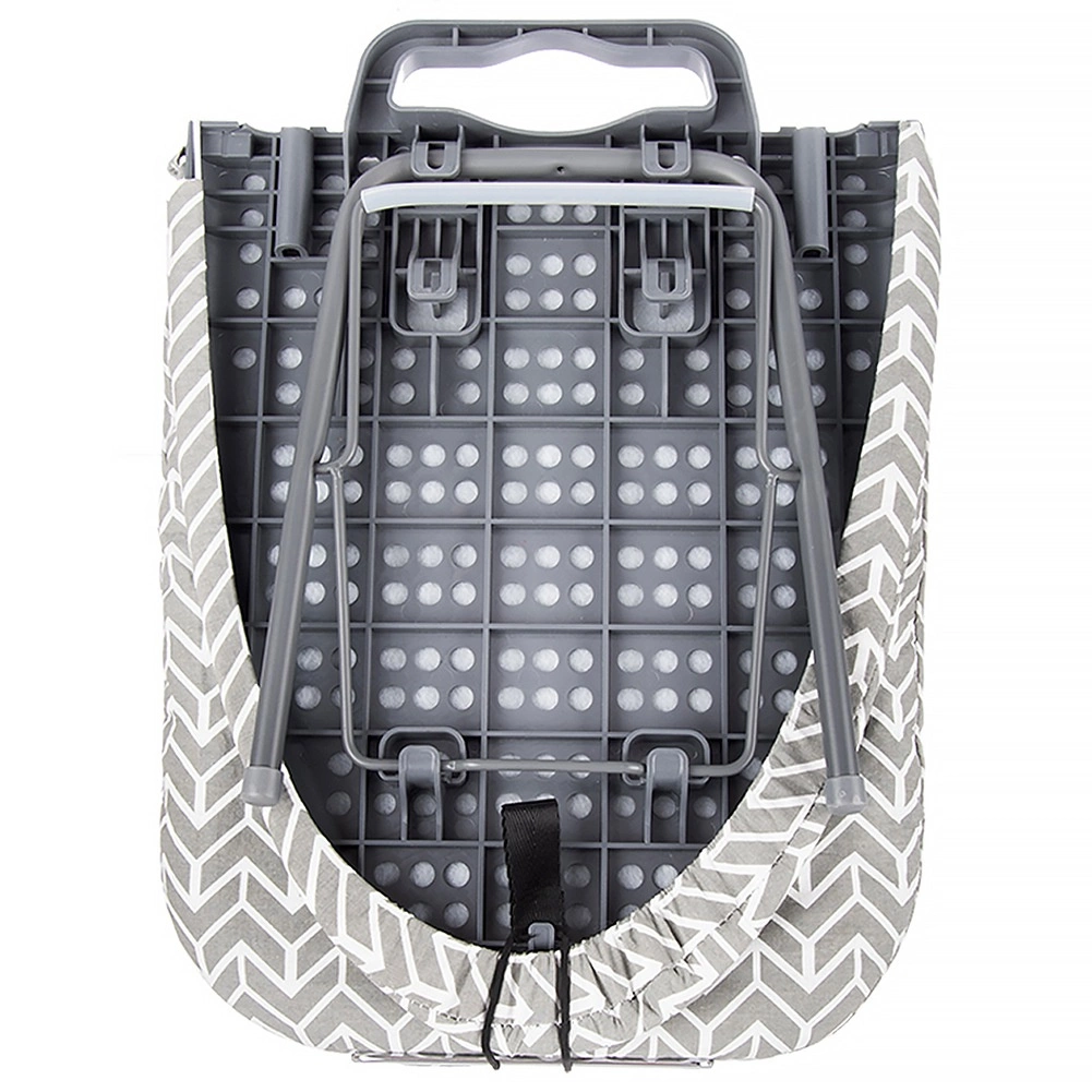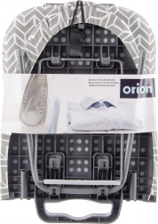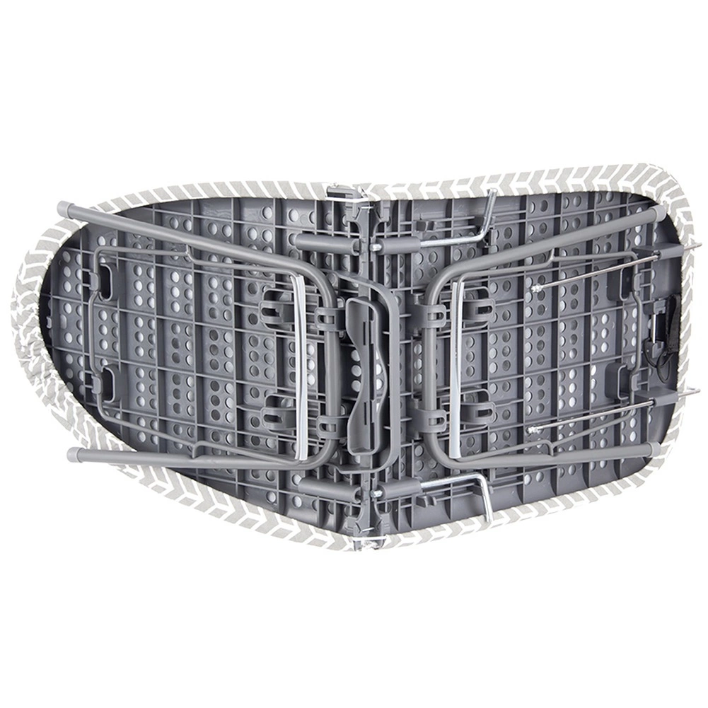Cadre métallique gris, pieds antidérapants et verrou de sécurité contre le repliement accidentel assurent un repassage sûr et confortable sur n’importe quelle table.