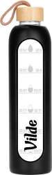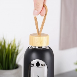 La housse en silicone noire protège le verre et assure une prise sûre, tandis que le bouchon en bambou naturel avec dragonne facilite le transport.