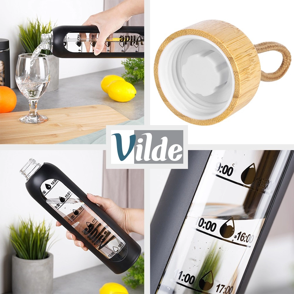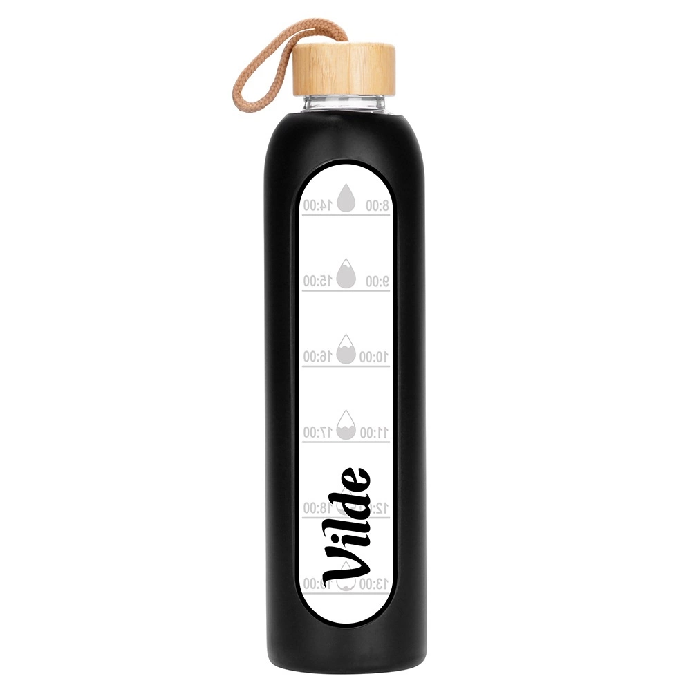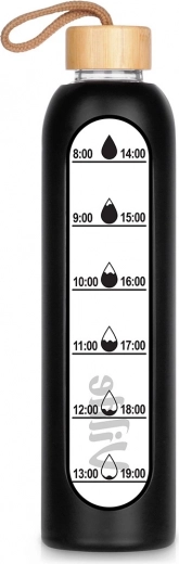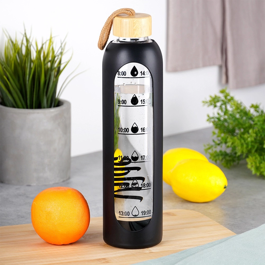 Restez hydraté avec style, même en déplacement. Cette élégante bouteille en verre de 1 L avec housse en silicone noire et bouchon à vis en bambou est idéale pour l’eau, les citronnades maison, les jus, les smoothies et les cocktails. Les repères horaires du matin au soir vous guident en douceur vers une hydratation régulière.