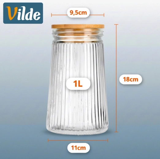 Bocal en verre élégant de 1 l avec couvercle en bambou et joint en silicone pour garder vos aliments frais plus longtemps. Grâce au verre nervuré transparent, vous contrôlez toujours le contenu tout en apportant à la cuisine un aspect soigné et élégant. Idéal pour le café, les biscuits, les pâtes, le muesli ou autres denrées sèches. Verre borosilicaté résistant et fermeture hermétique pour préserver fraîcheur et arômes.