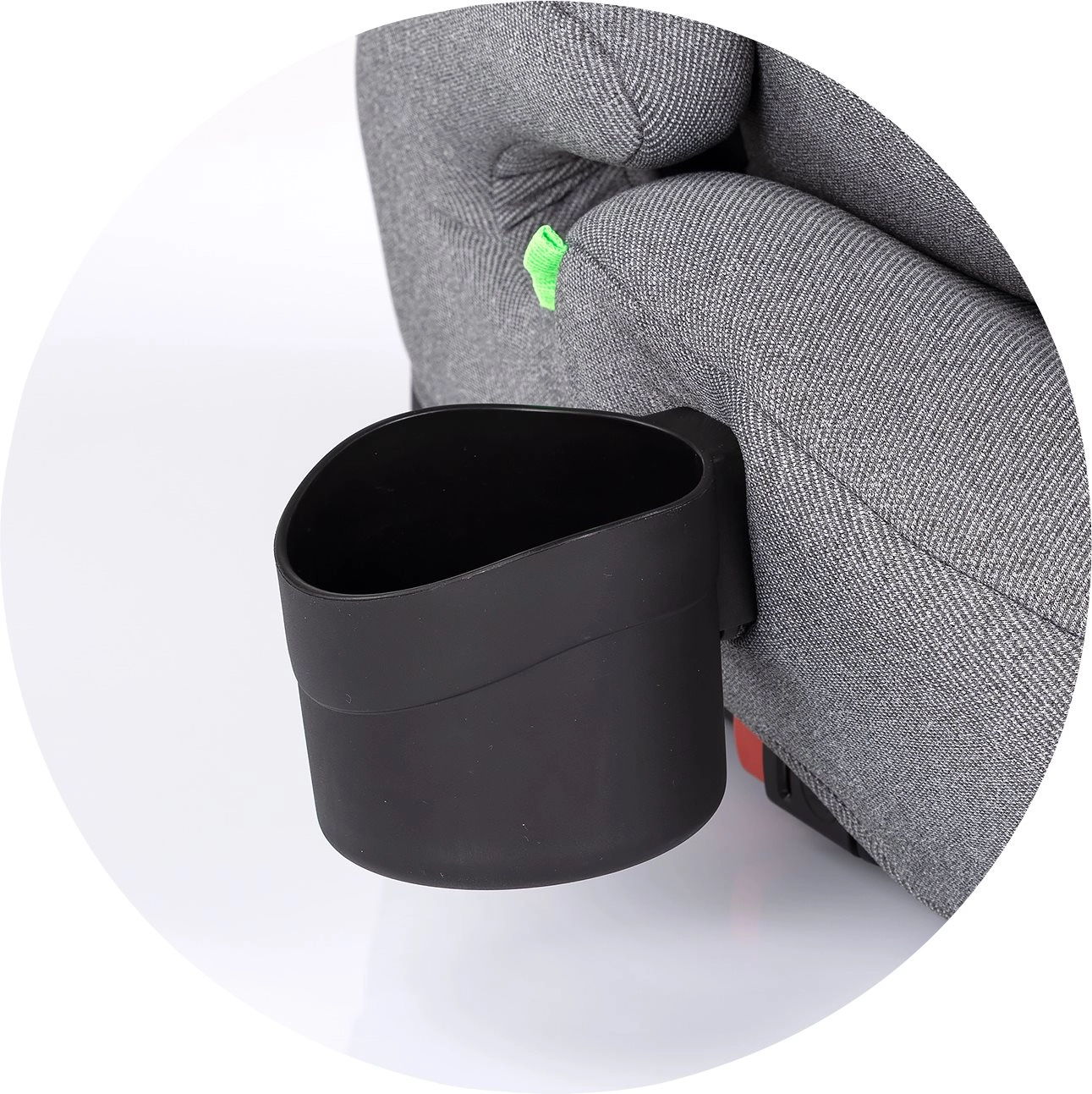 Un rembourrage moelleux, un appui-tête réglable et un harnais 5 points avec coussinets offrent confort et maintien. Un porte-gobelet pratique et une housse facilement lavable sont inclus.