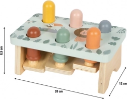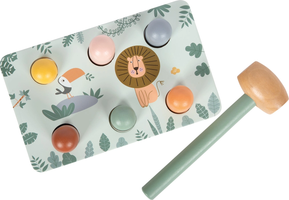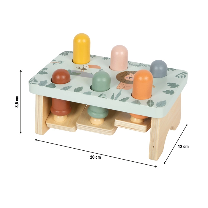 Découvrez le banc à marteler ludique au motif safari de small foot, en bois 100 % certifié FSC. À l’aide du marteau, les enfants enfoncent les chevilles et vivent un moment surprenant : lorsqu’une cheville disparaît, une autre ressort de l’autre côté ! Ce jouet aux adorables motifs d’animaux, aux bords lisses et arrondis et à la structure en bois robuste favorise la motricité fine, la coordination œil–main et la compréhension de la cause et de l’effet.
