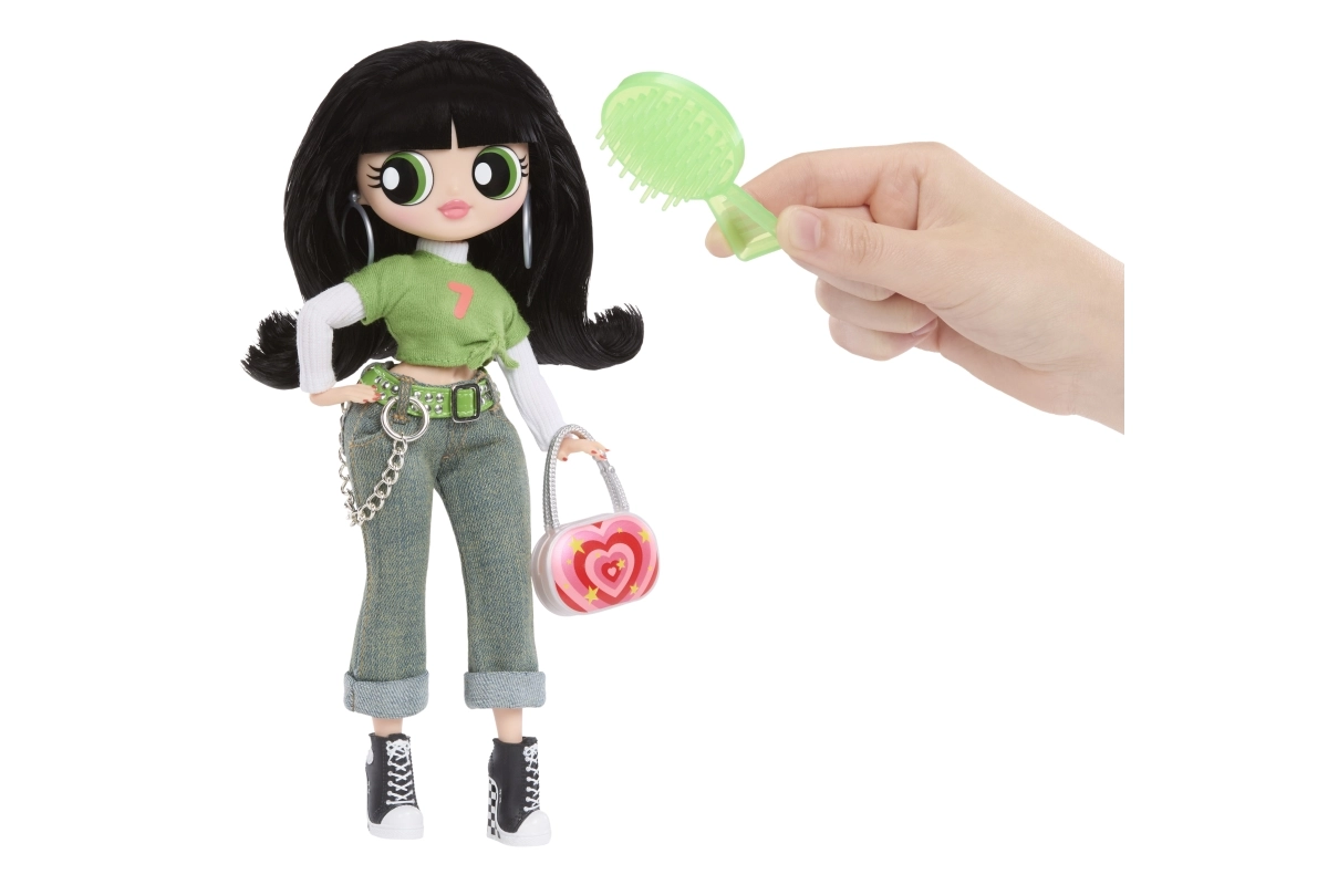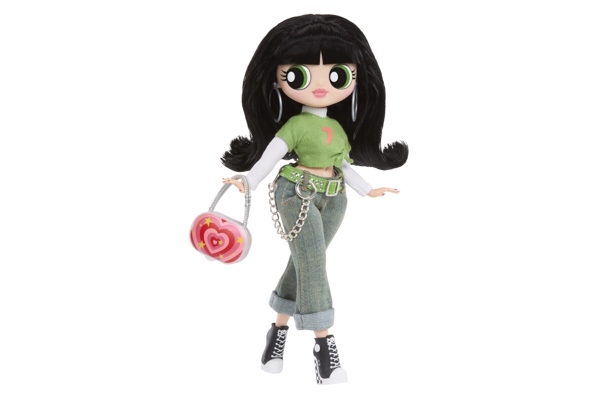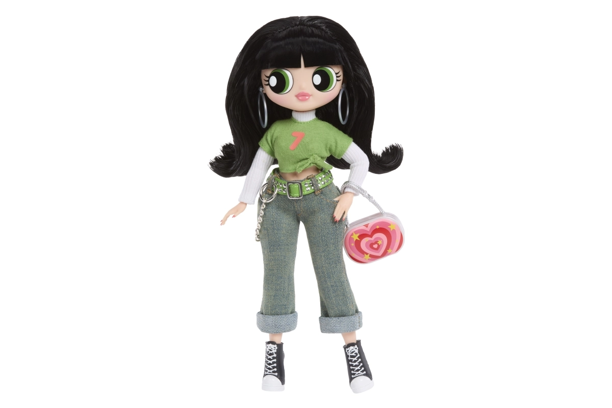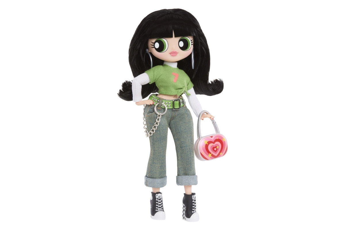 Un crop top vert, un jean avec chaîne et des baskets noires, complétés par un sac audacieux et des boucles d’oreilles – le look iconique de Buttercup en version L.O.L.