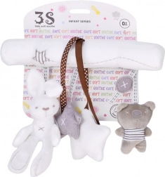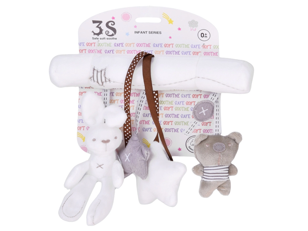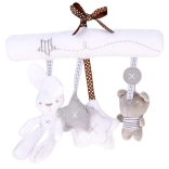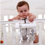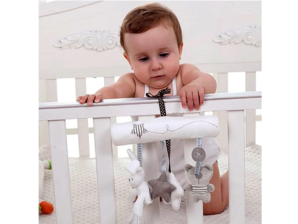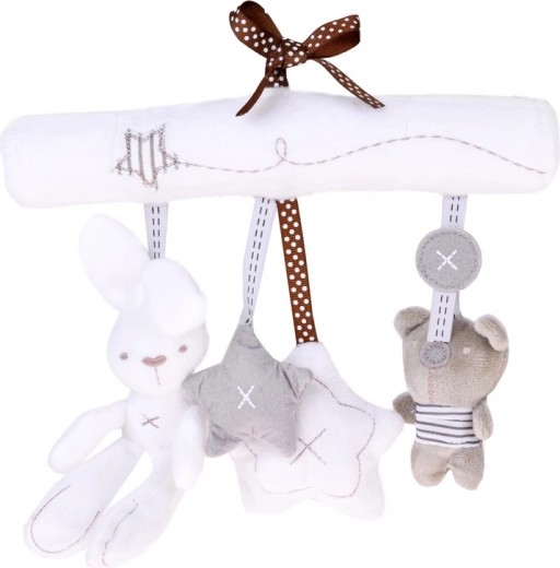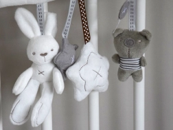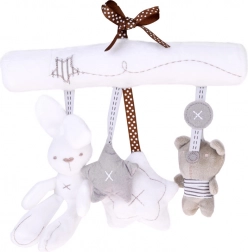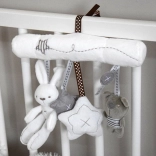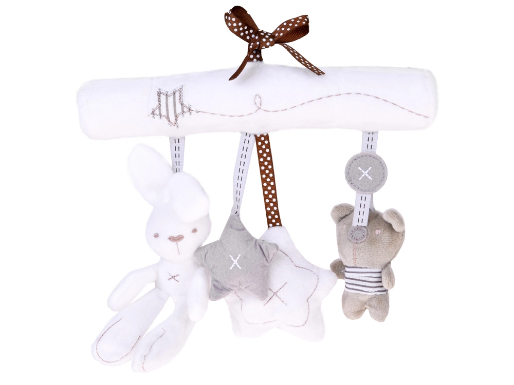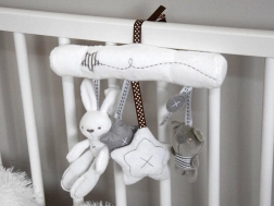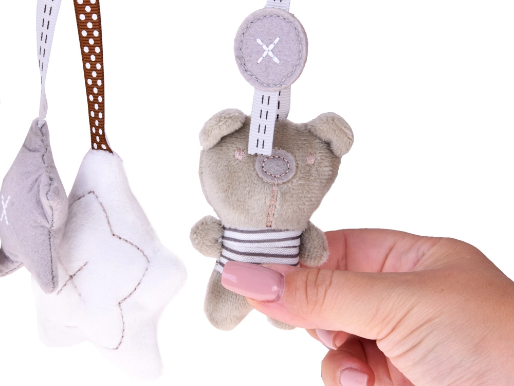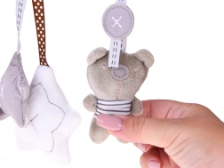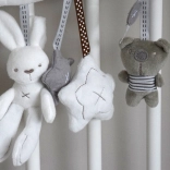 Adorable jouet suspendu aux couleurs neutres qui ravira bébé à la maison comme en déplacement. Il se fixe facilement au lit ou à la poussette à l’aide de rubans. Il offre un peluche douce et moelleuse, une stimulation sensorielle délicate et des sons amusants : en appuyant sur le ventre du lapin, une courte mélodie retentit, l’étoile blanche possède un pouet-pouet et l’ourson fonctionne comme un hoca.
