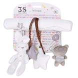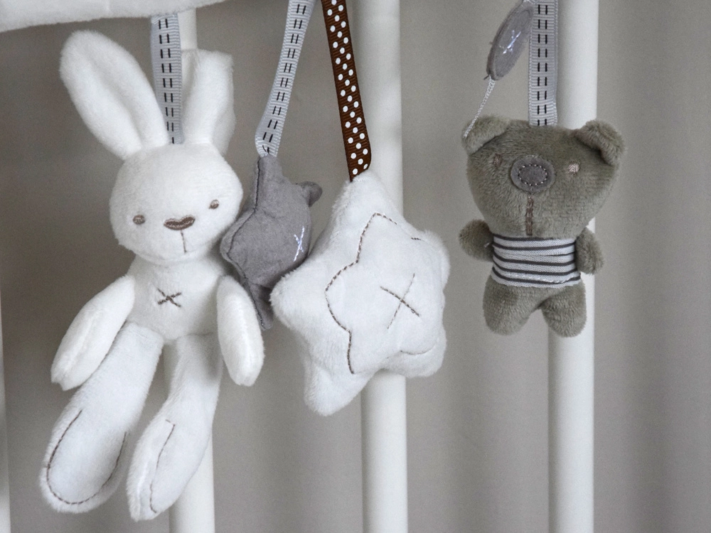 - 3 éléments suspendus – lapin avec mélodie, étoile avec pouet-pouet, ourson hochet.