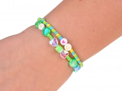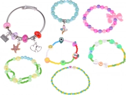 - Perles de différentes formes et couleurs, pendentifs/charms, bracelet métallique à enfiler, chaîne, boucles d’oreilles (clips), 2 bagues, 2 élastiques pour cheveux avec décorations, 3 barrettes décoratives, 2 nœuds, bobine de fil élastique, pince, livret d’idées