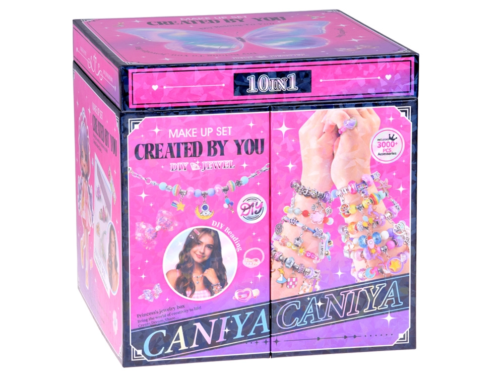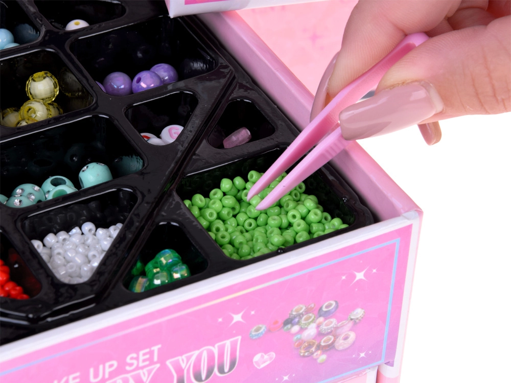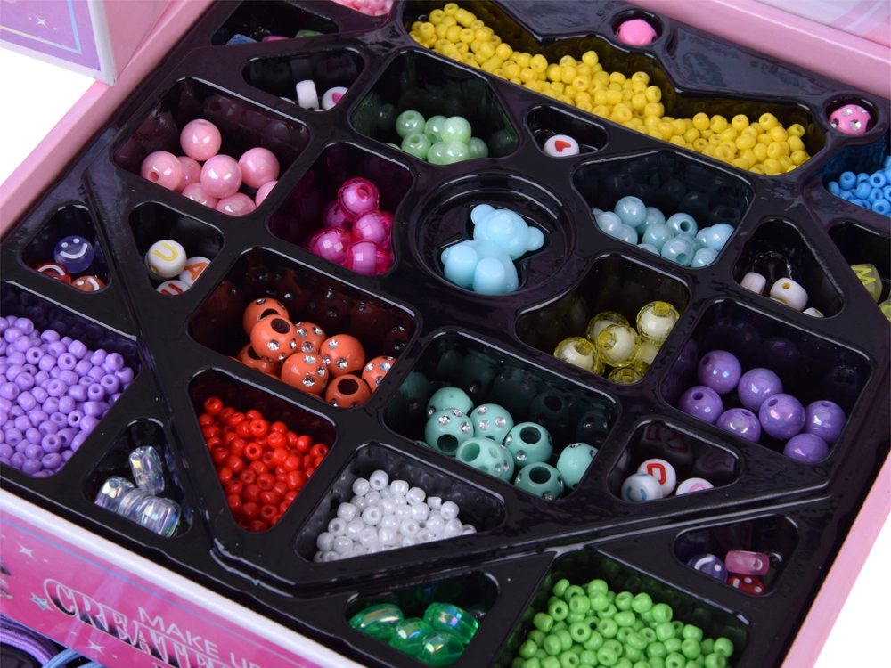 La boîte propose trois niveaux bien organisés : en haut un grand miroir et des compartiments pour bagues, boucles d’oreilles et accessoires de bracelets et de chaînes, au milieu des perles colorées de formes et de tailles variées pour un enfilage facile, et en bas des accessoires pour cheveux – élastiques, barrettes et nœuds – pour parfaire le styling. Grâce au fil élastique et à la pince, l’enfilage est confortable même pour les débutants.