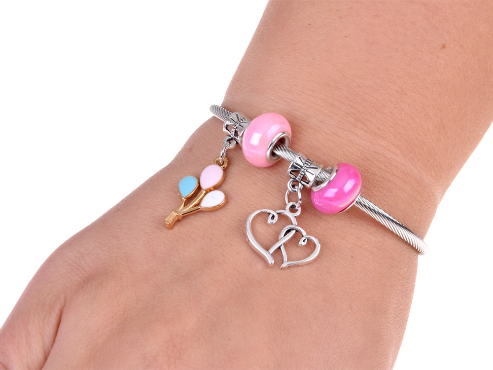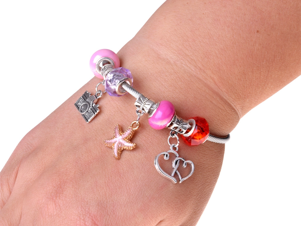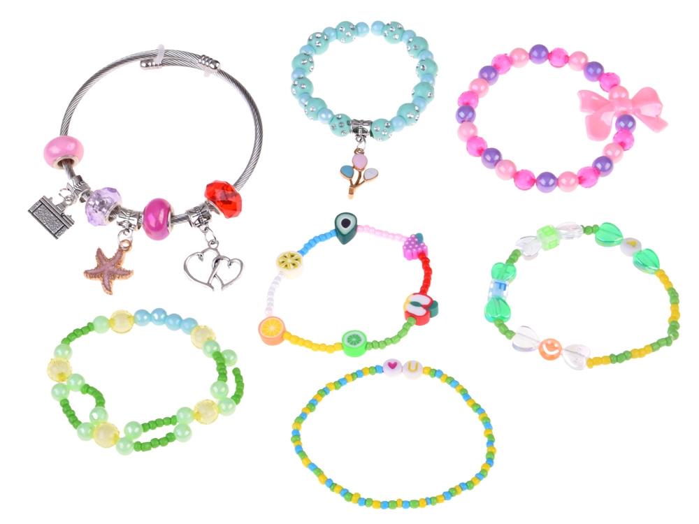 Des perles colorées, des charms et des pendentifs permettent de concevoir des bracelets et des colliers uniques. Le fil élastique et la pince facilitent l’enfilage même pour les plus jeunes enfants.