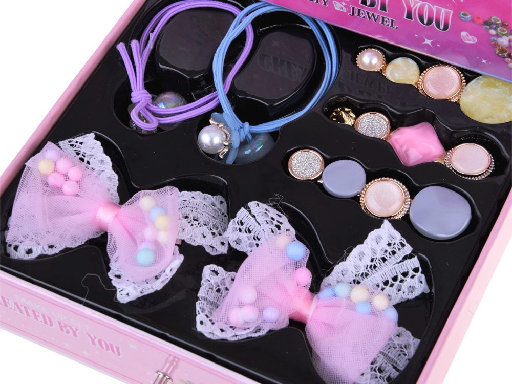 - Accessoires complets : perles, pendentifs, bracelet métallique, chaîne, boucles d’oreilles à clip, 2 bagues, fil élastique, pince, élastiques, barrettes, nœuds
