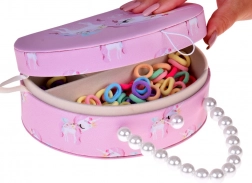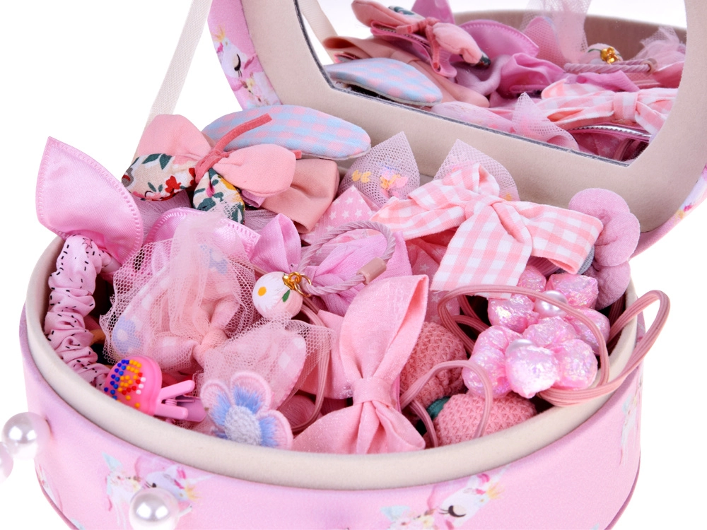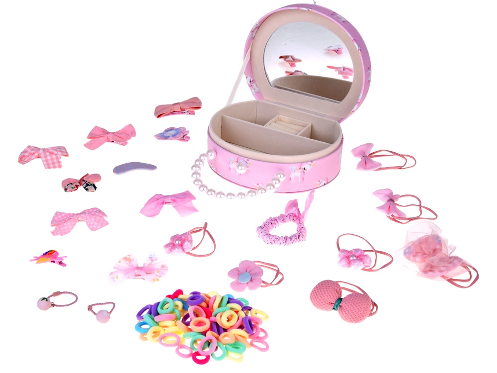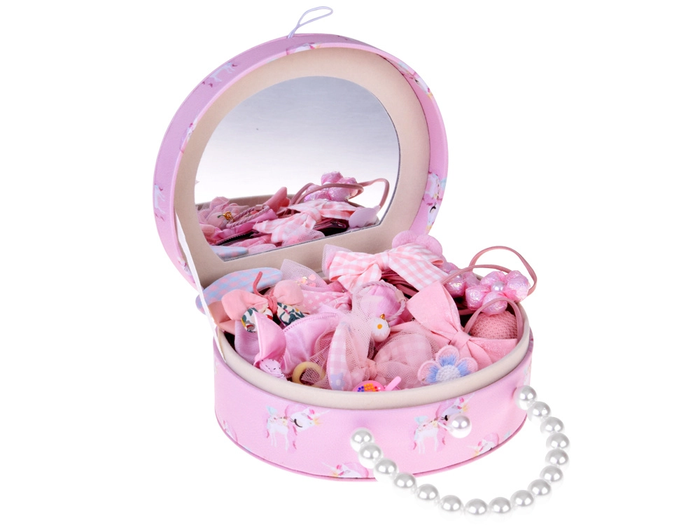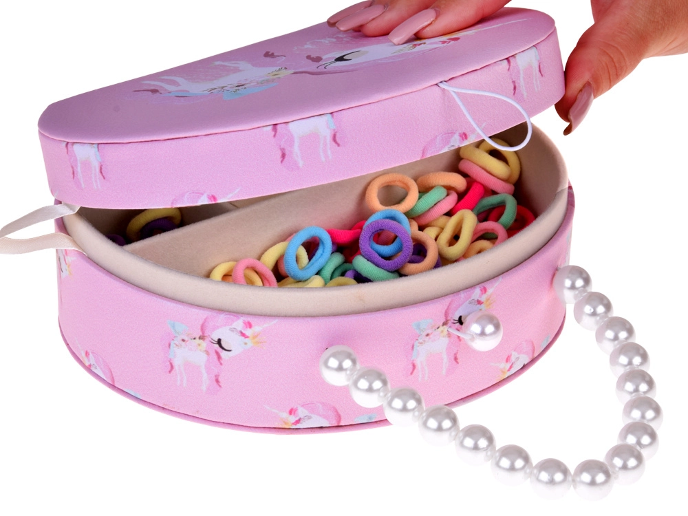 Élégante boîte à bijoux ovale en simili-cuir rose tendre décorée d’une licorne, idéale pour ranger la bijouterie fantaisie et les accessoires cheveux des enfants. À l’intérieur se trouvent un miroir intégré, un doux rembourrage et 3 compartiments (2 petits et 1 grand), ainsi qu’un espace pour bagues. La poignée perlée facilite le transport lors des visites ou des soirées chez les amis.