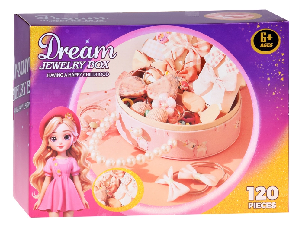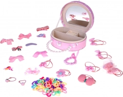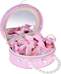 Le set d’accessoires généreux encourage la créativité en coiffure et la décoration stylée des cheveux. Vous y trouverez 10 barrettes variées (nœuds, papillon, fleurs, ovale), 10 élastiques décoratifs (avec fleur, nœud, pompon ou petites oreilles) et environ 100 mini élastiques aux couleurs vives. Un collier de perles complète la tenue.