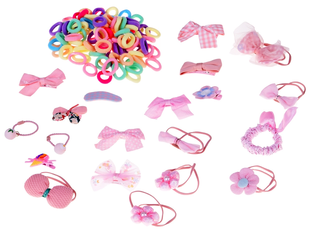 10 barrettes, 10 élastiques décoratifs et env. 100 mini élastiques de différentes couleurs pour des coiffures créatives.